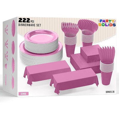 Exquisite Pink Party Tableware Set – 222-Piece Disposable Dinnerware Kit Serves 20 Guests | Paper Plates, Plastic Cups, Cutlery, Napkins & Table Cover
