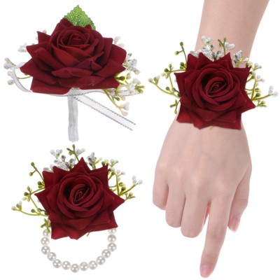 Unique Bargains Artificial Floral Wedding Prom Wrist Corsage and Boutonnieres Set Red 2 Pcs