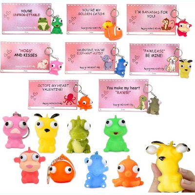 4E's Novelty 24 Pack Valentines Cards with Popping Eye Animals, Pop Out Eyes Squeeze Toy Keychain with Cards