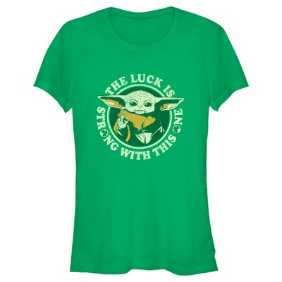 Juniors Womens Star Wars: The Mandalorian St. Patrick's Day Grogu Luck is Strong with this One Distressed T-Shirt