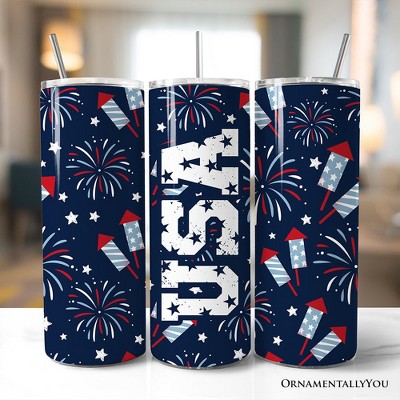 Fireworks USA Block Letters 20oz Tumbler With Lid and Stainless Steel Straw, Vintage July 4th Patriotic Gift Cup | OrnamentallyYou