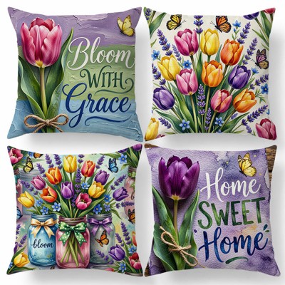 Lomsoe 4pcs Multicolored Tulip Pattern Printed Pillow Cover, Suitable for Spring, Mother's Day, Party, Living Space, 18x18inch.