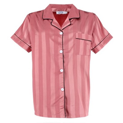 CTM Women's Short Sleeve Thick Striped Satin Pajama Set