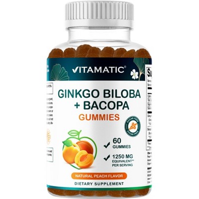 Ginkgo Biloba + Bacopa Gummies – 1250 mg Equivalent | Natural Peach Flavor | 60 Vegan Gummies