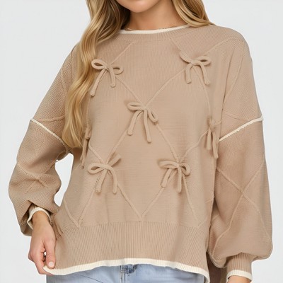 Knit & Lounge Women’s Bow Detail Knit Sweater Long Sleeve Textured Diamond Pattern Soft Cozy Fabric Contrast Trim Relaxed Fit