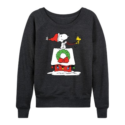 Women's - Peanuts - Snoopy and Woodstock House Sleigh Lightweight French Terry Wide Neck Long Sleeve Graphic Shirt
