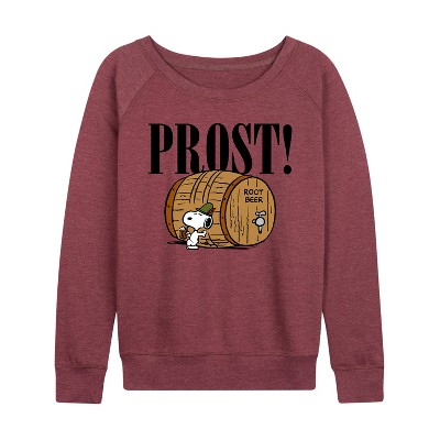 Women's - Peanuts - Prost Snoopy Root Beer Lightweight French Terry Wide Neck Long Sleeve Graphic Shirt
