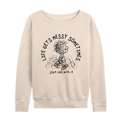 Women's - Peanuts - Life Gets Messy Pig Pen Lightweight French Terry Wide Neck Long Sleeve Graphic Shirt