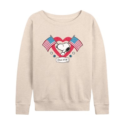 Women's - Peanuts - Snoopy Since 1776 Flag Heart Lightweight French Terry Wide Neck Long Sleeve Graphic Shirt