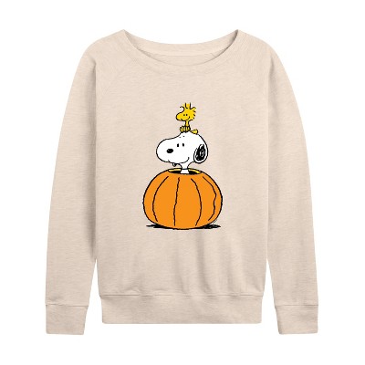 Women's - Peanuts - Snoopy Woodstock Pumpkin Lightweight French Terry Wide Neck Long Sleeve Graphic Shirt