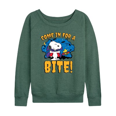 Women's - Peanuts - Snoopy Come In For A Bite Lightweight French Terry Wide Neck Long Sleeve Graphic Shirt
