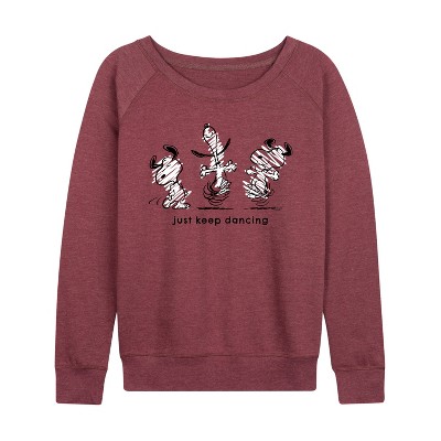 Women's - Peanuts - Snoopy Just Keep Dancing Lightweight French Terry Wide Neck Long Sleeve Graphic Shirt