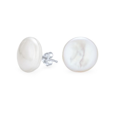 Bling Jewelry Baroque Irregular Round Coin Shaped White Biwa Coin Freshwater Cultured Pearl Stud Earrings Sterling Silver