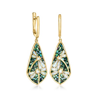 Ross-Simons Mother-Of-Pearl and Abalone Shell Dragonfly Mosaic Drop Earrings in 18kt Gold Over Sterling