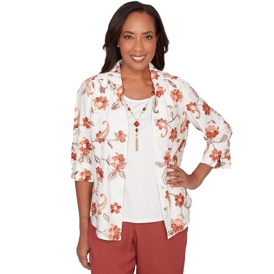 Alfred Dunner Womens Petite Paisley Floral Collared Two In One Top With Necklace, Ivory, Size PL
