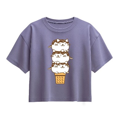 Girls' - Instant Message - Kawaii Cat Ice Cream Cone Short Sleeve Boxy Graphic T-Shirt