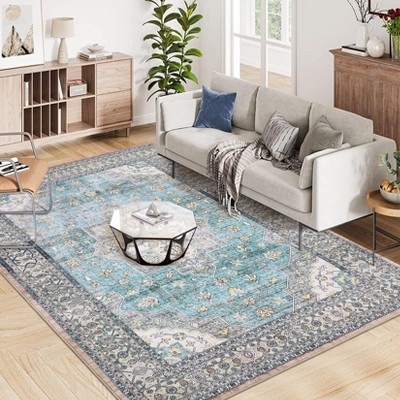 Washable Rug Non Slip Vintage Rug Foldable Indoor Carpet Ultra-Soft Retro Medallion Distressed Floor