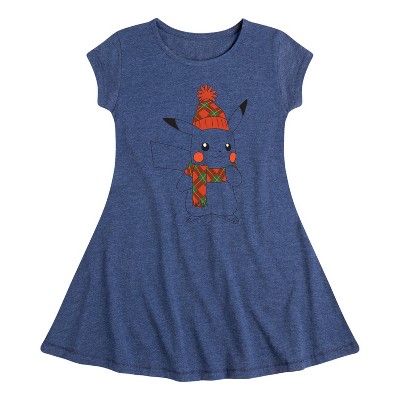 Girls' Pokémon Bundled Up Pikachu Fit & Flair Cap Sleeve Graphic Dress - Heather Navy - Medium