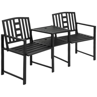 Outsunny Metal Garden Bench with Middle Table and Umbrella Hole, 2-in-1 Double Patio Chairs, Outdoor 2-person Tete-a-Tete, Slatted, Black