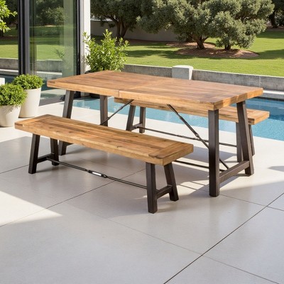3-Piece Outdoor Patio Picnic Dining Set with 2 Benches, Acacia Wood and Metal Frame