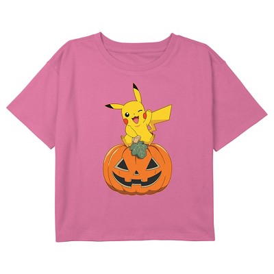 Girl's Pokemon Halloween Jack-o'-Lantern Pikachu Graphic Graphic Cropped T-Shirt