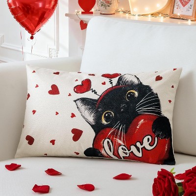 Lomsoe 1pc Valentine's Day Linen Throw Pillow Cover Red Love Heart Black Cat Anniversary Wedding Decorative Pillow Case for Sofa Couch.