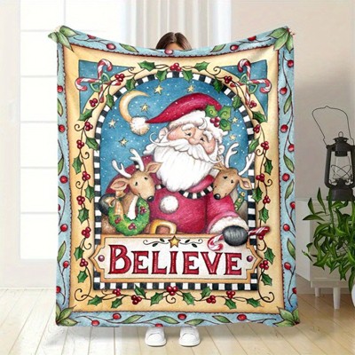 Lomsoe Cute Santa Claus and Reindeer Print Flannel Blanket - All Seasons Soft Cozy Warm Throw Blanket for Bed, Napping, Camping, Travel, Office