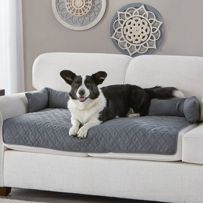 Gulches Scandinavian Elevated Small Pet Sofa, Walnut Wood Legs & Bent Back, Dark Grey Velvet Cushion, Orthopedic Support, Easy Assembly