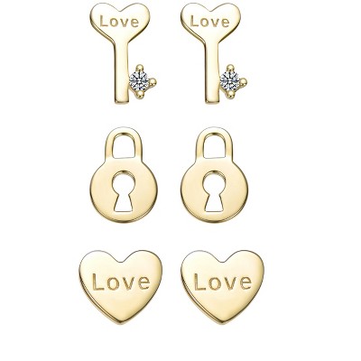 Guili 14K Gold Plated “Love & Lock” Stud Earring 3-Piece Set with Heart, Key, and Lock Designs with Clear Cubic Zirconia for a Chic, Coordinated Look