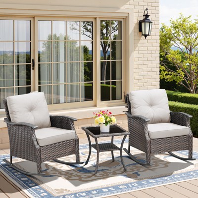 Celebalcony 3 Piece Outdoor Rocking Chair Set, Front Porch PE Wicker Rattan Small Bistro Set,Cushioned Patio Rocker Chair Set with Glass Table (Beige)