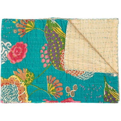 HomeRoots 50" X 70" Teal And Pink Floral Cotton Quilted Kantha Throw Blanket with Embroidery
