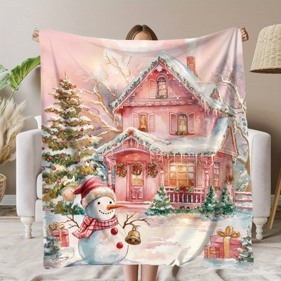 Lomsoe Pink Christmas Snowman & House Print Flannel Blanket - All Seasons Soft and Warm Throw Blanket for Bed, Napping, Camping, Travel, Office