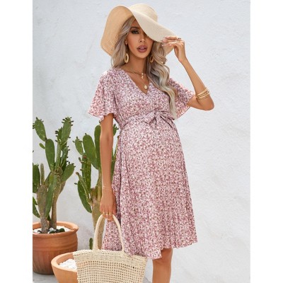 Womens Maternity Dress Flutter Short Sleeve V Neck Floral Babydoll Dress