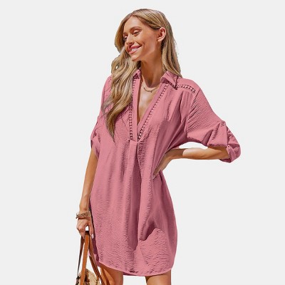 Cupshe Women's V-Neck Roll-Up Sleeve Cover Up Dress with Crochet Trim