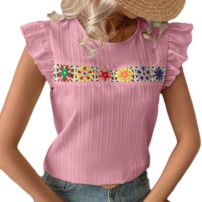 Women's Round Neck Ruffled Sleeveless Blouse Embroidered Floral Shirts Top