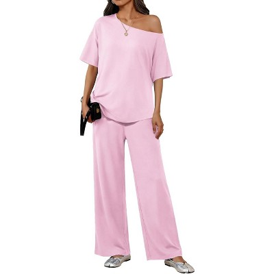 Ekouaer Lounge Sets for Women Off Shoulder(Right) Short Sleeve Tops and Long Pants 2 Piece Set Summer Soft Matching Outfit