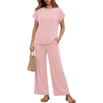 Ekouaer Two Piece Sets for Women 2026 Travel Outfits Short Sleeve Top Wide Leg Pants Rib Tracksuits Summer Fashion Lounge Set