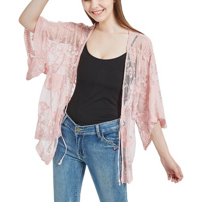 INSPIRE CHIC Women's Tie Front Ruffled Hem Floral Lace Sheer Crop Bolero Shrug
