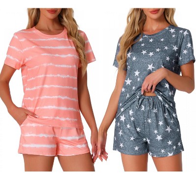 INSPIRE CHIC Women's 2Pcs Pajama Set Round Neck Short Sleeve Top and Drawstring Shorts Loungewear Set