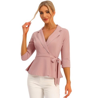 Allegra K Women's Notch Lapel Collar 3/4 Sleeve Tie Waist Peplum Top