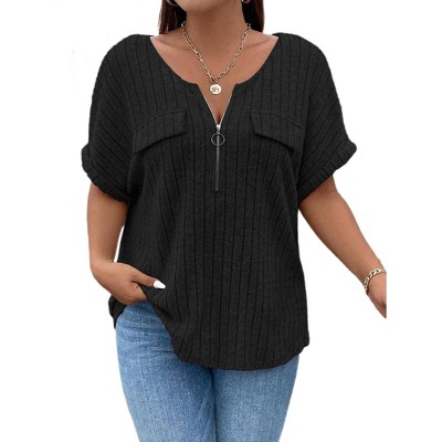 Tops for Women V Neck Zipper Fake Pocket T-Shirts Oversized Ladies Tops Ribbed Short Sleeve Tunic Top