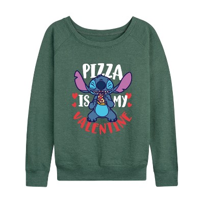 Women's - Lilo & Stitch - Pizza Is My Valentine Lightweight French Terry Wide Neck Long Sleeve Graphic Shirt