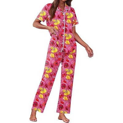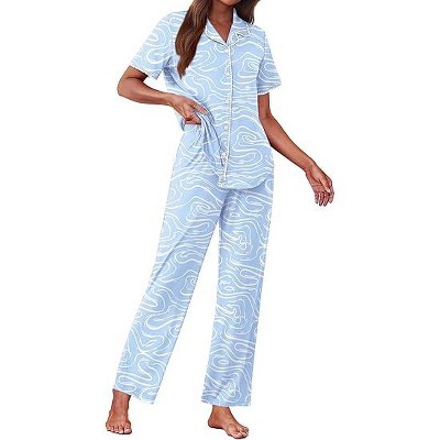 Anna-Kaci Lounge Women's Abstract Floral Woven Pajama Set with Long Sleeve Button Top and Wide Leg Pants - Small, White