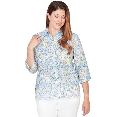 Alfred Dunner Womens Embroidered Floral Border Button Down Top, Blue Multi, Size XL