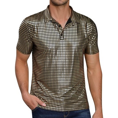 BLUEMING Mens Shirt Short Sleeve Polo Vintage Sequin Metallic 70s Outfits Party Costume Top
