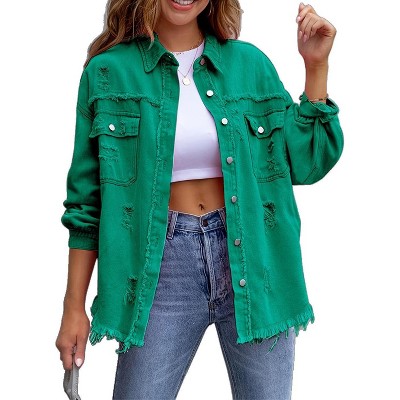 Women's Jean Jacket Frayed Washed Button Up Cropped Denim Jacket With Pockets