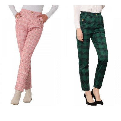 INSPIRE CHIC Women's Vintage Tartan Plaid Elastic Waist Straight Long Trousers 2 Packs