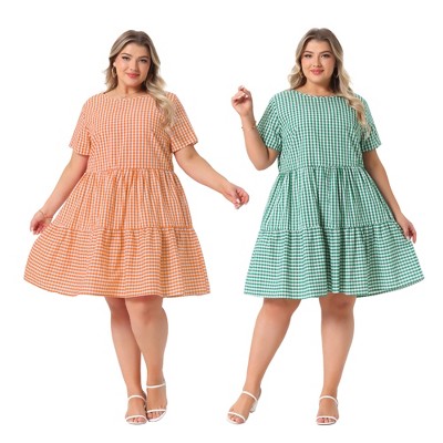 Women's Plus Size Gingham Vintage Plaid Round Neck Short Sleeve Tiered A-Line Midi Summer Two Piece Dress - Agnes Orinda
