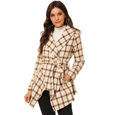 Allegra K Women's Shawl Collar Asymmetric Hem Thin Belted Plaids Wrap Coat