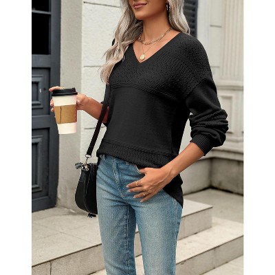 Women Long Sleeve Ribbed Knit Pullover V Neck Lightweight Crochet Pullover Sweater Fall Sweaters Casual Top Solid black,S